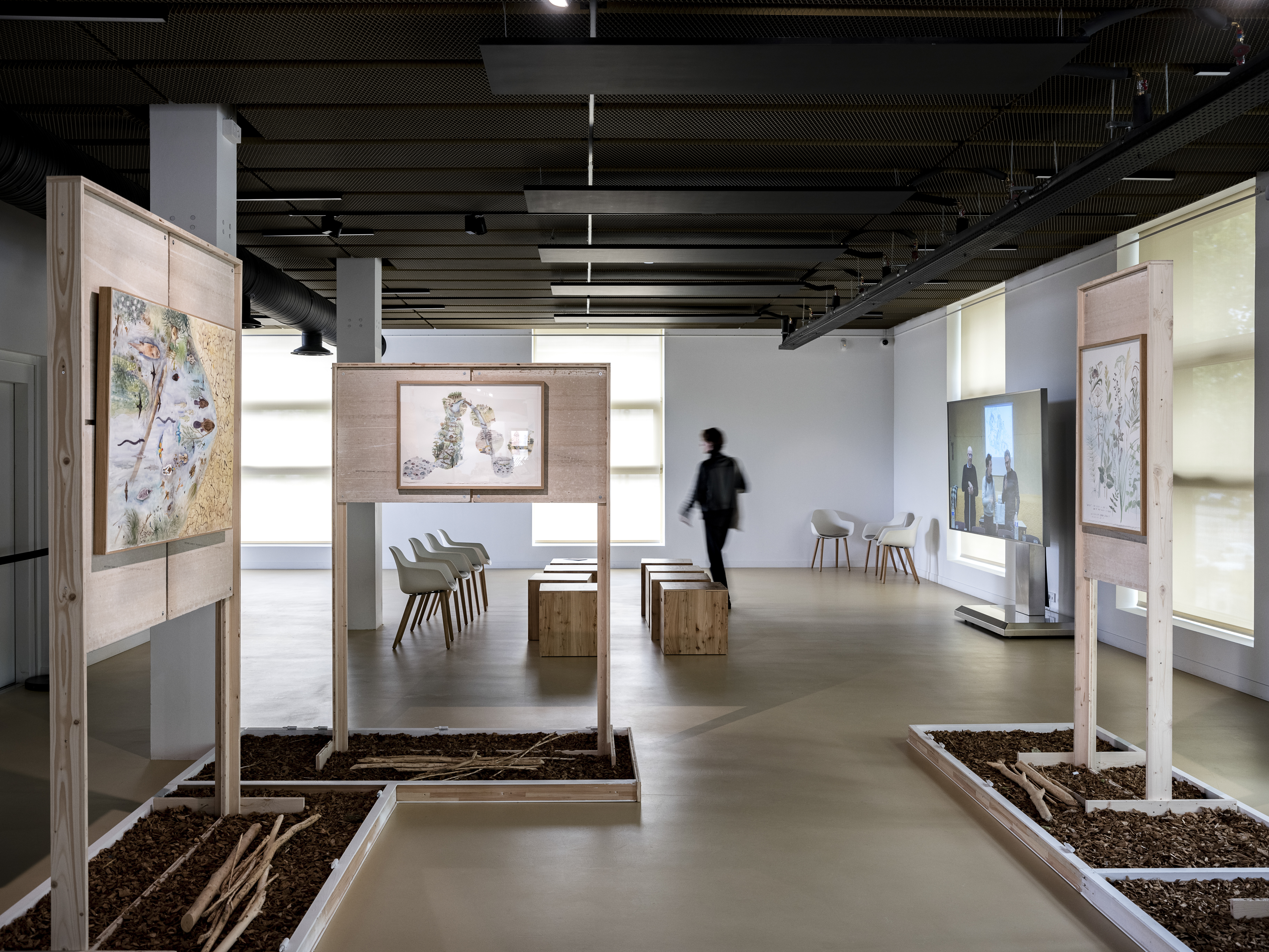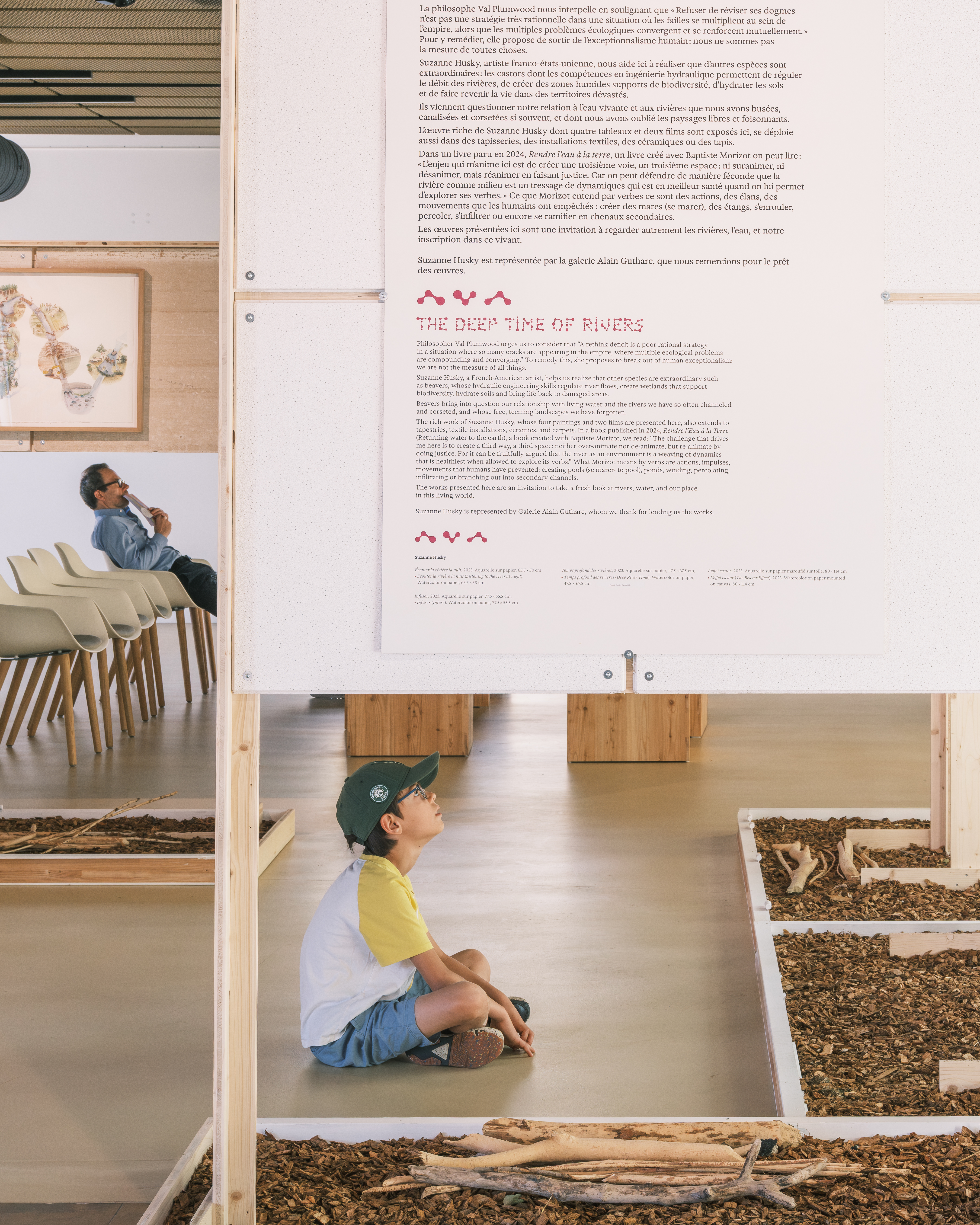 La scénographie, pensée par Atelier +1, invente des parcours et des mobiliers composés entièrement en matériaux de réemploi avec par exemple l’utilisation de 127 portes provenant des chambres du Village des Athlètes des JOP 2024, réemployées pour réaliser les supports d’affichage, ou encore 3600 dalles de faux-plafond servant de pieds pour les tables venant du bâtiment CNP Montparnasse.
