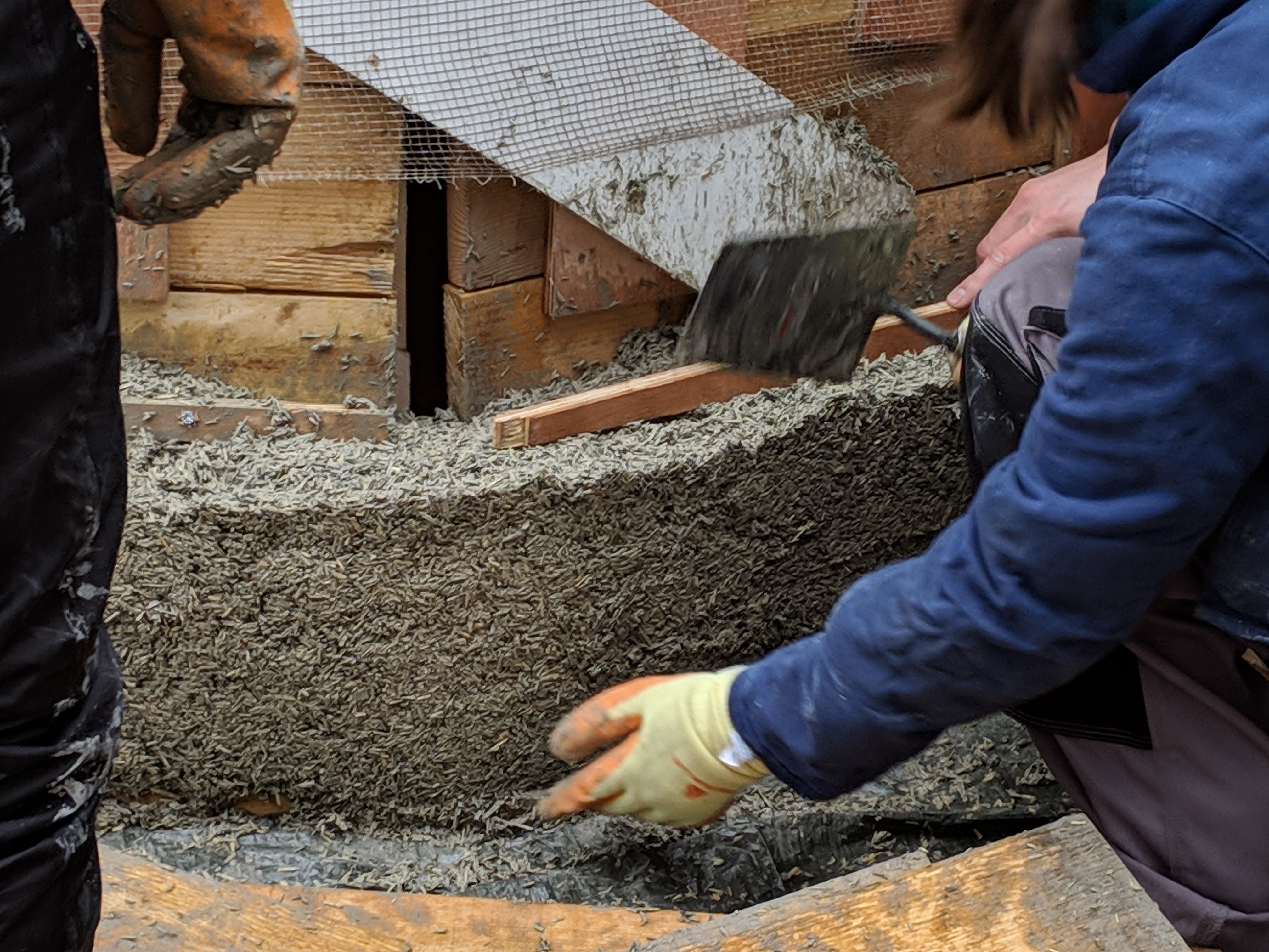 Elle est composée d’une structure en bois, d’un maillage en fibre de lin et recouverte de béton de chanvre sur une épaisseur de 15cm.