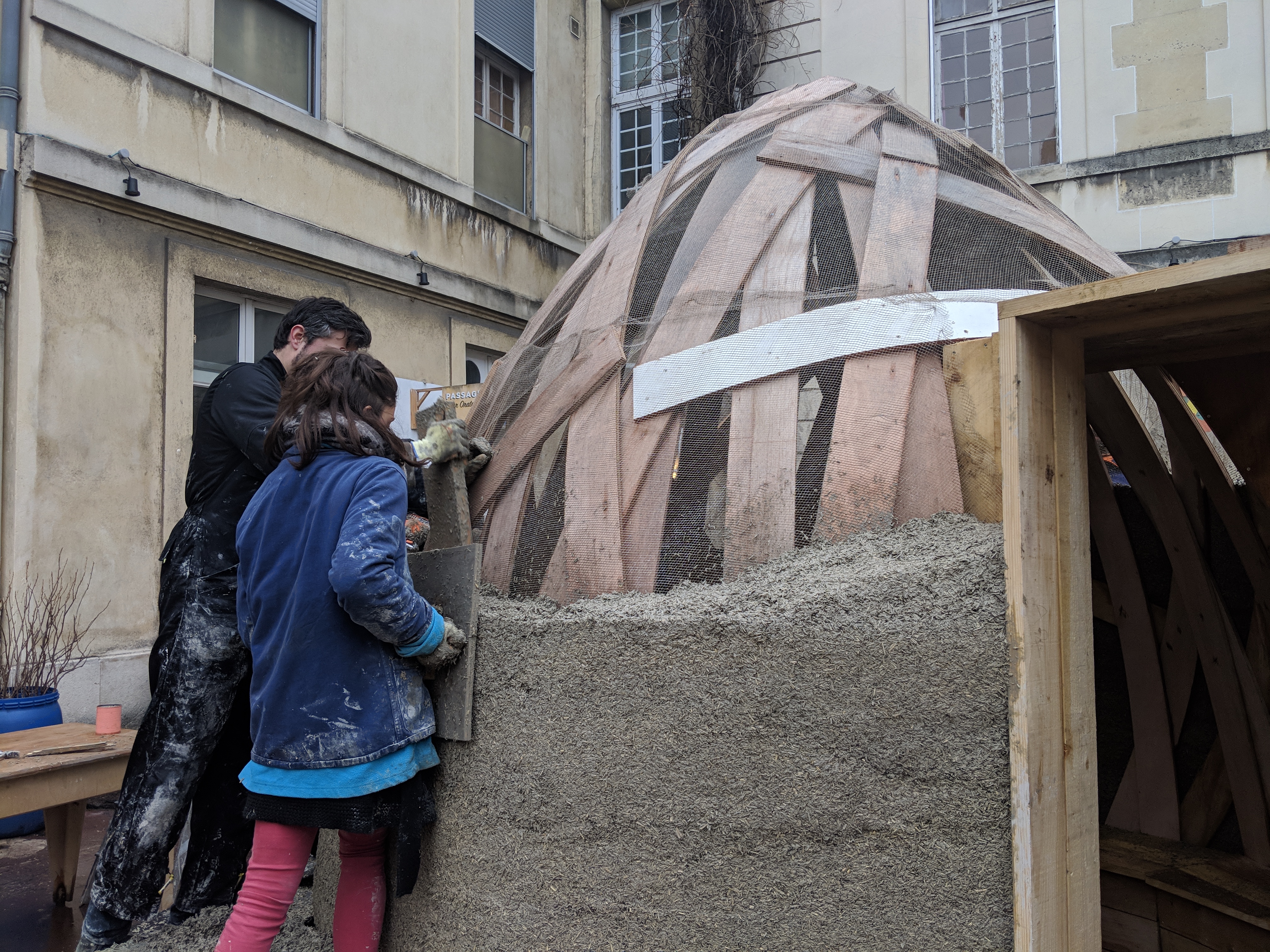 La hutte hammam a été étudiée avec Laurent Mouly (ingénieur), elle est capable de stocker 350 kg de Co2/m2 et a permis d’évaluer le comportement mécanique et énergétique du béton de chanvre dans des conditions extrêmes d’humidité et de température.