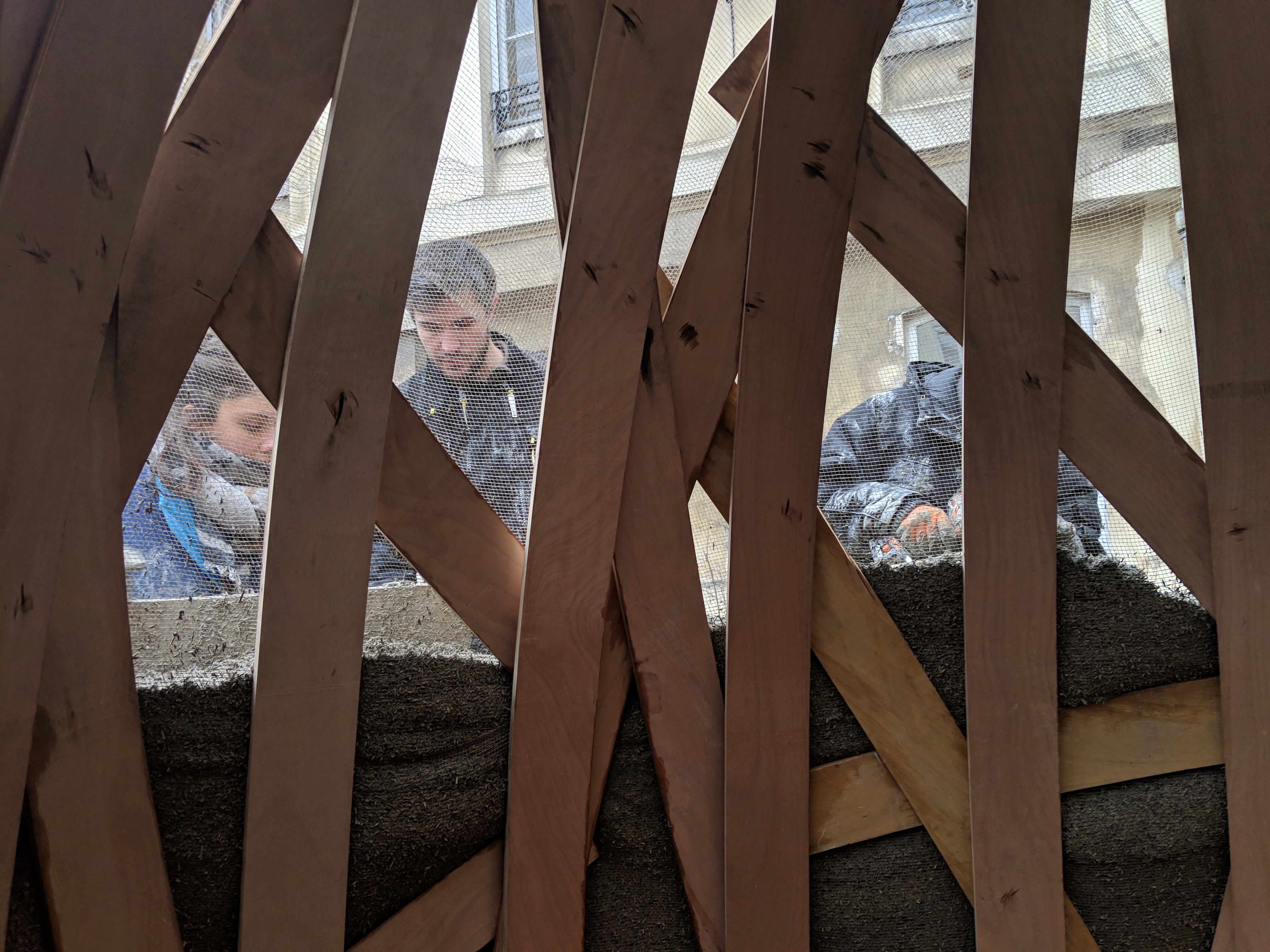 Le bois est, lui, issu du démontage d’une préfiguration de mobilier urbain de la mairie du 14ème sur l’avenue René Coty. Ce chantier-école à été réalisé avec le concours de Gérard Lenain, formateur de Construire en Chanvre, et grâce au partenariat des entreprises Farc et BCB Tradical.