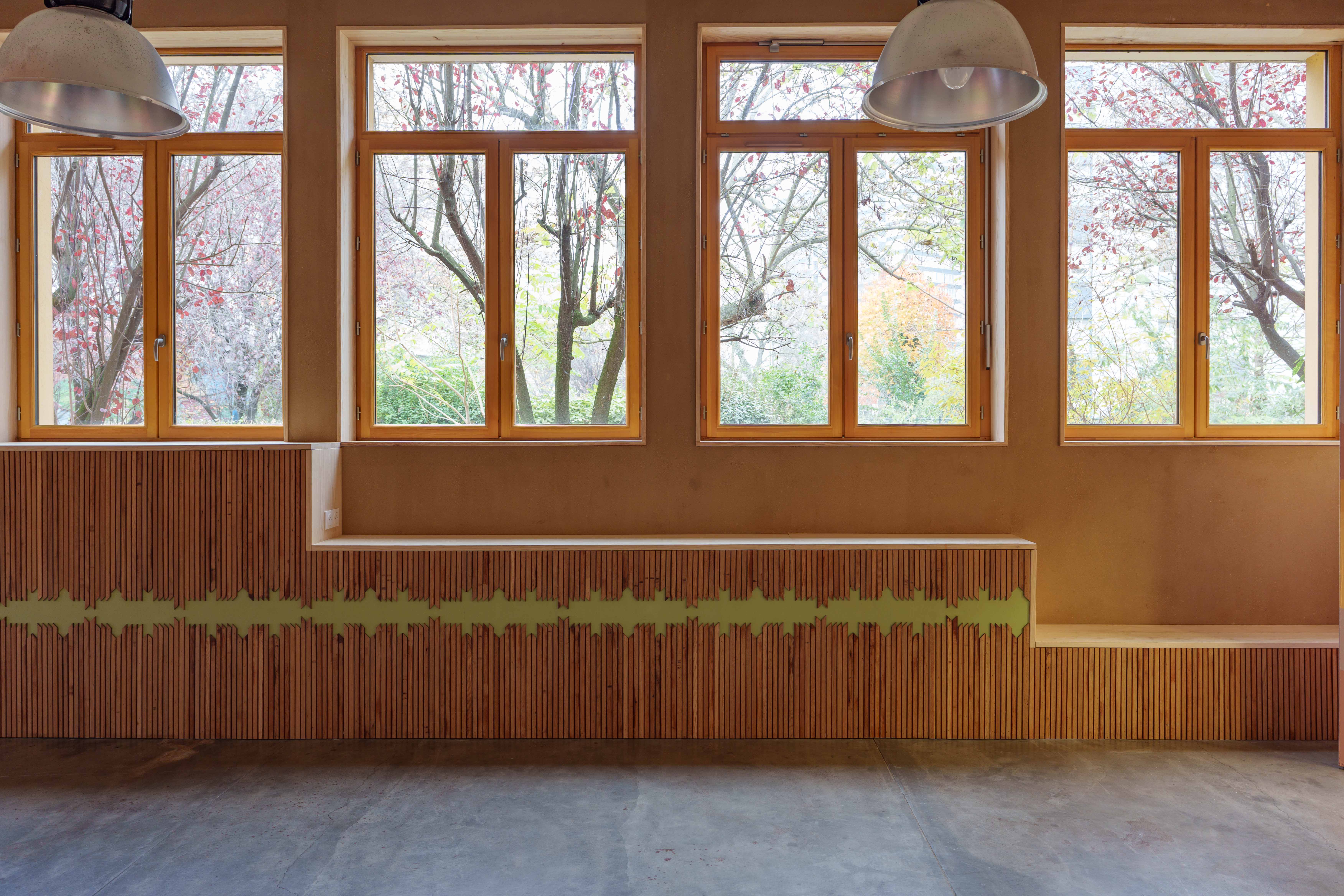 Le projet est composé de la création d’un mur habité, proposant des aménagements (assises, tables,…), d’un espace atelier et d’un nouveau sas d’entrée.