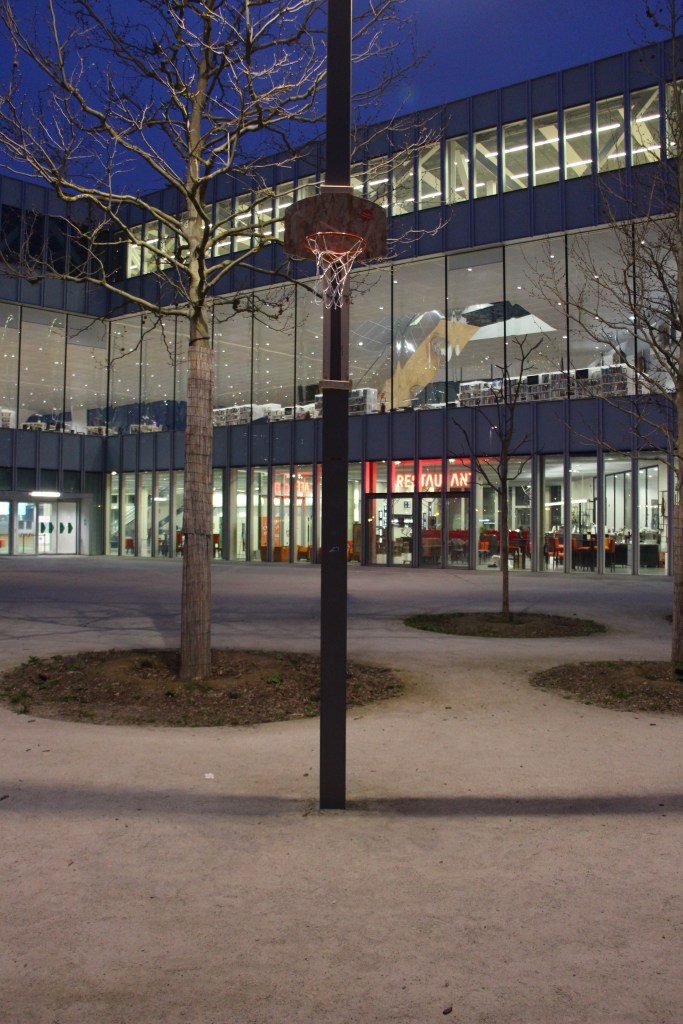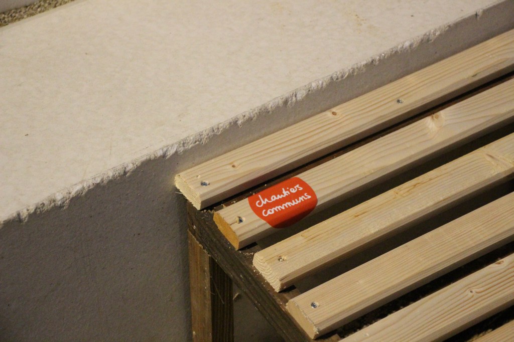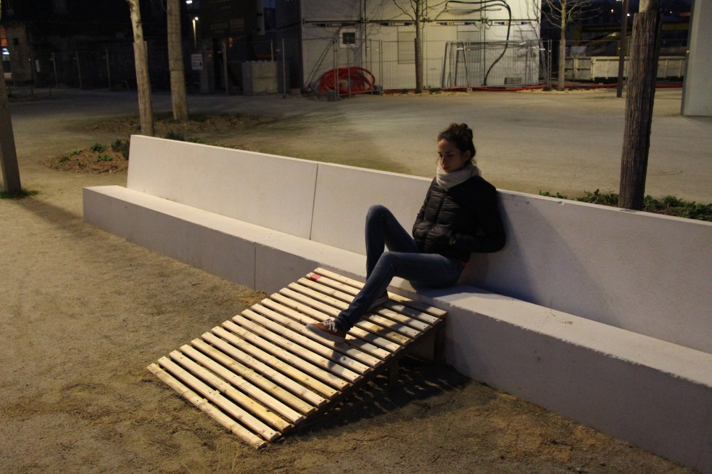 Un abri, deux tables, un panier de basket et un repose-pieds sont venus se greffer aux bancs et lampadaires existants, tous construits en bois de réemploi.