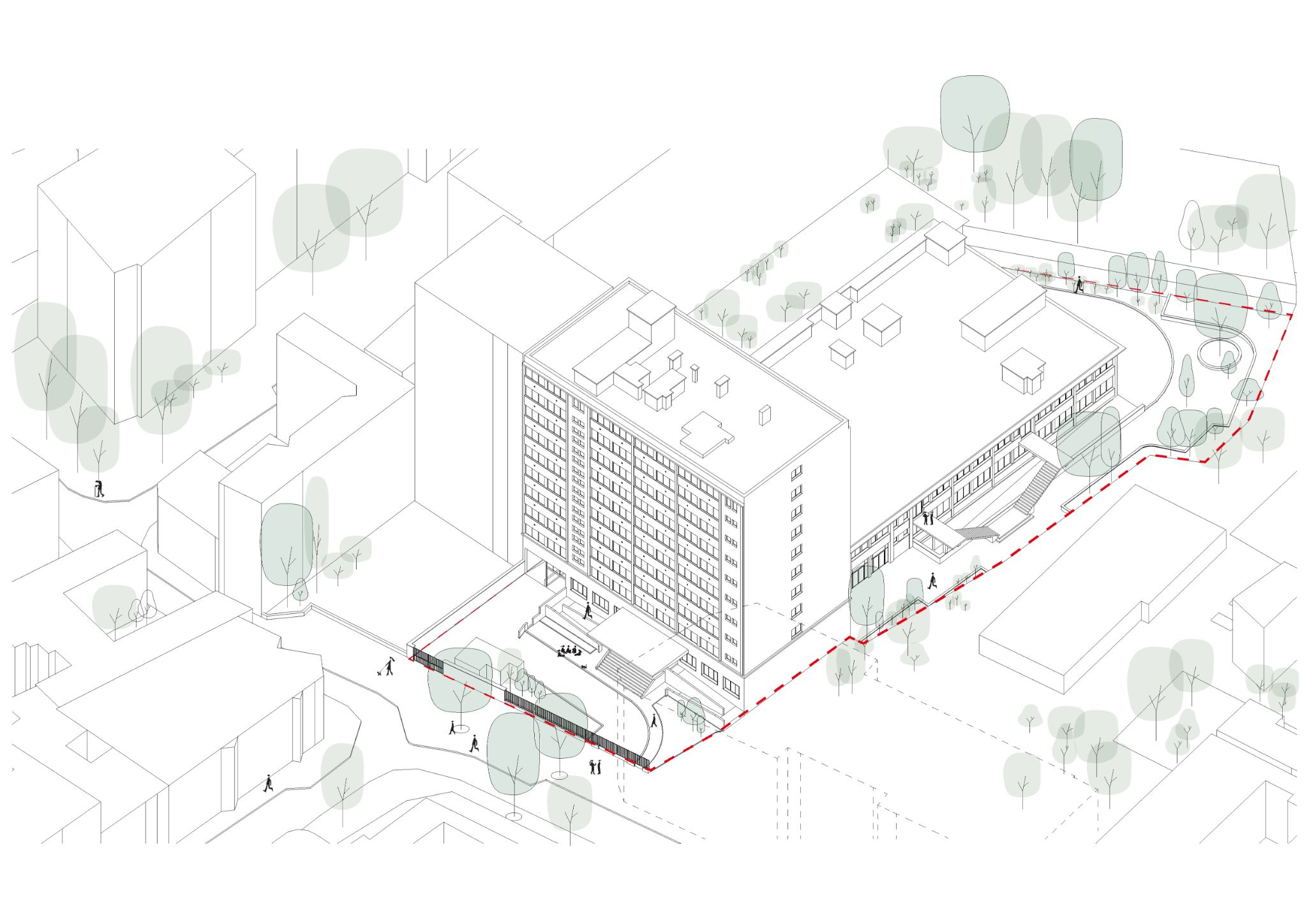 A partir du diagnostic architectural et des ateliers participatifs menés avec tou.te.s les acteur.ice.s, nous avons pu développer 3 scénarios distincts. Ils présentaient cependant des bases communes : une plus forte adaptabilité des logements, une nouvelle réflexion sur la circulation intérieure des bâtiments, un réaménagement des espaces extérieurs, une rénovation thermique par l’extérieur. Tous ces scénarios se dérouleraient en site occupé, avec une logique de travaux dite en « opération tiroir ».