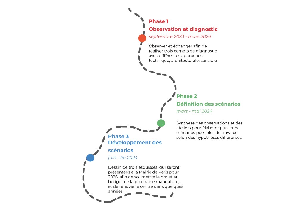 La Ville de Paris a souhaité réaliser cette étude de manière concertée avec les résident.e.s, les professionnel.le.s et les partenaires. Les premières phases du projet, concertation et faisabilité, ont été menées pendant l’année 2024.