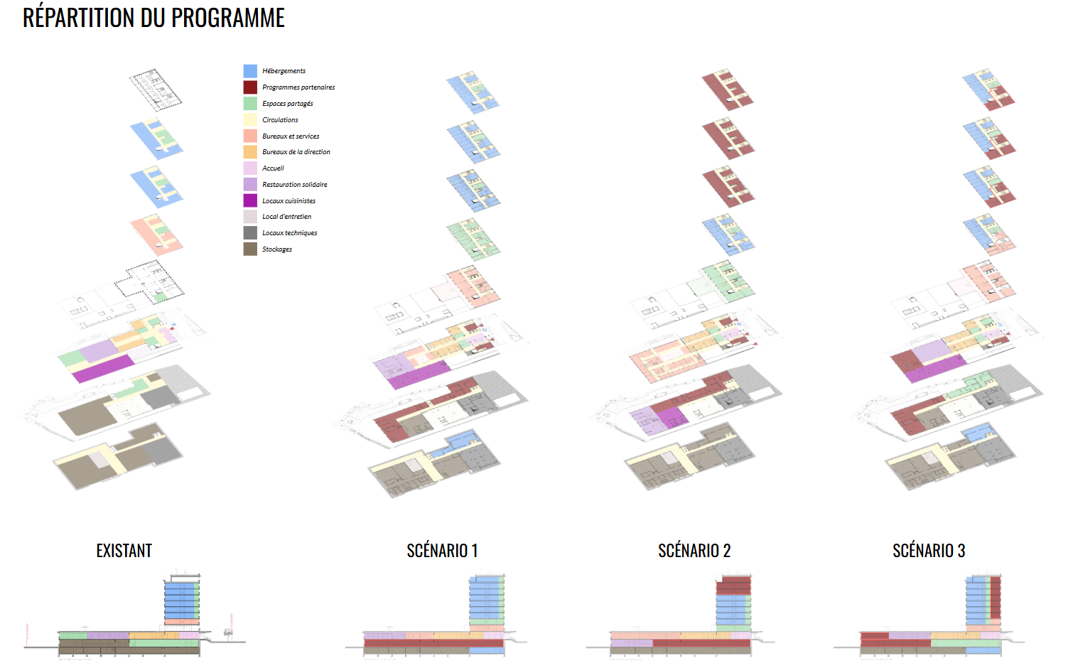 Les scénarios se différencient par leur répartition par étage, où les logements, les bureaux et espaces communs se répartissent autrement suivant les scénarios.